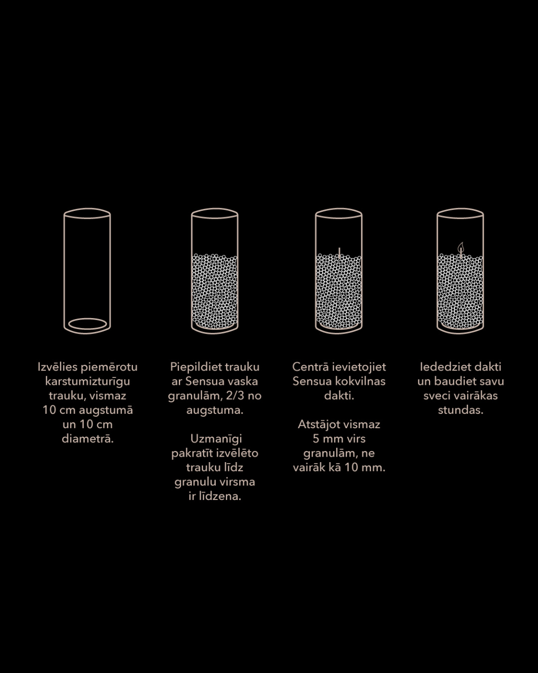 Sensua granulu sveces ir mūsu praktiskākais produkts, kas nezaudē savu vizuālo pievilcību. Tās izgatavotas no dabiskām sastāvdaļām, kas nesatur naftas produktus, un pildāmas elegantos traukos, ātri piešķirot svecei vēlamo veidolu.